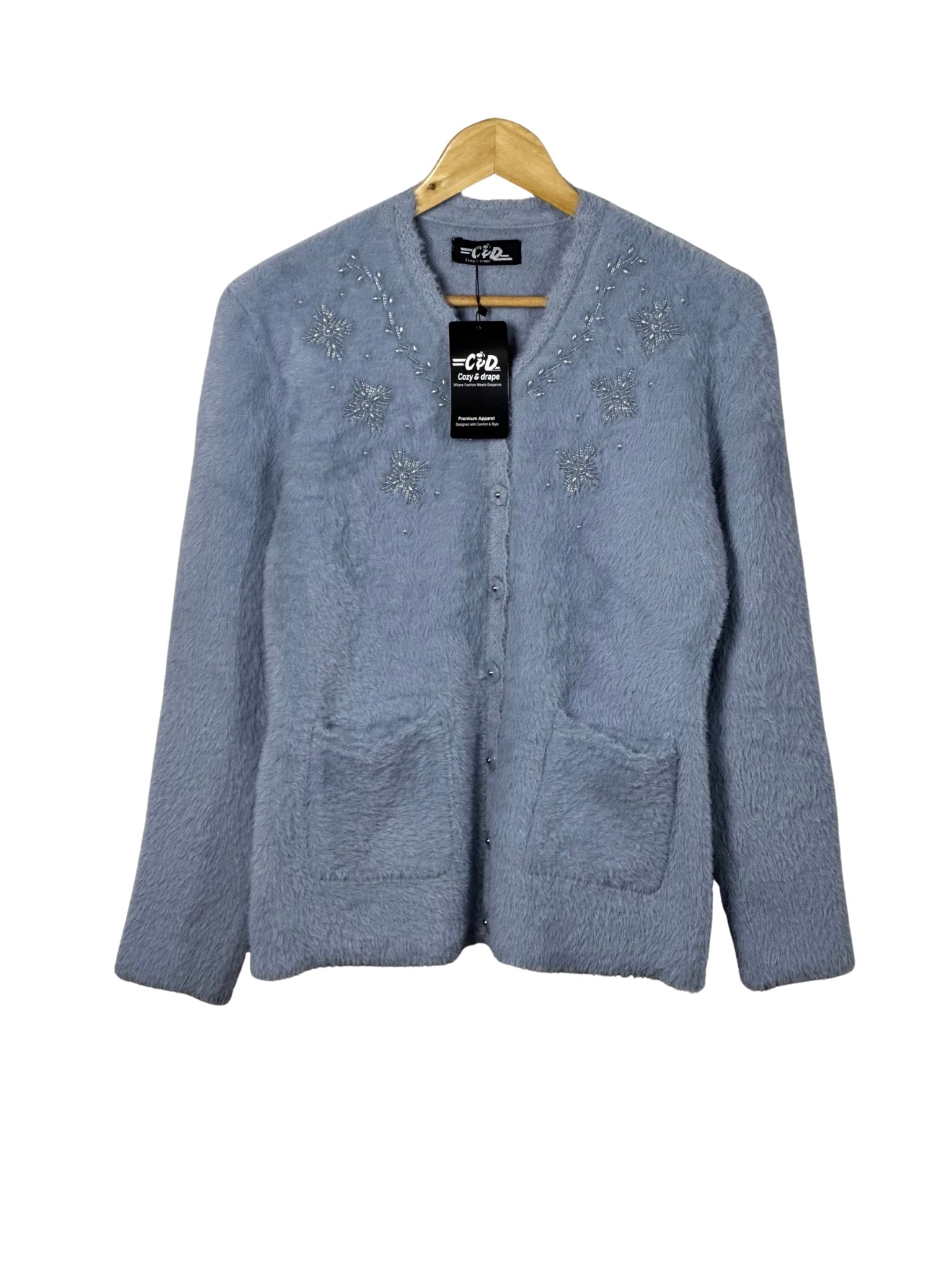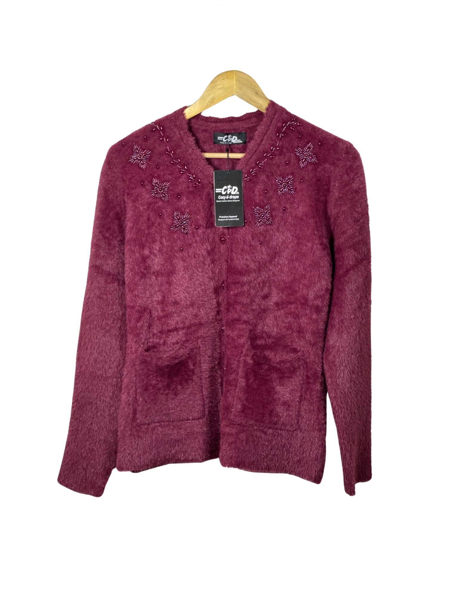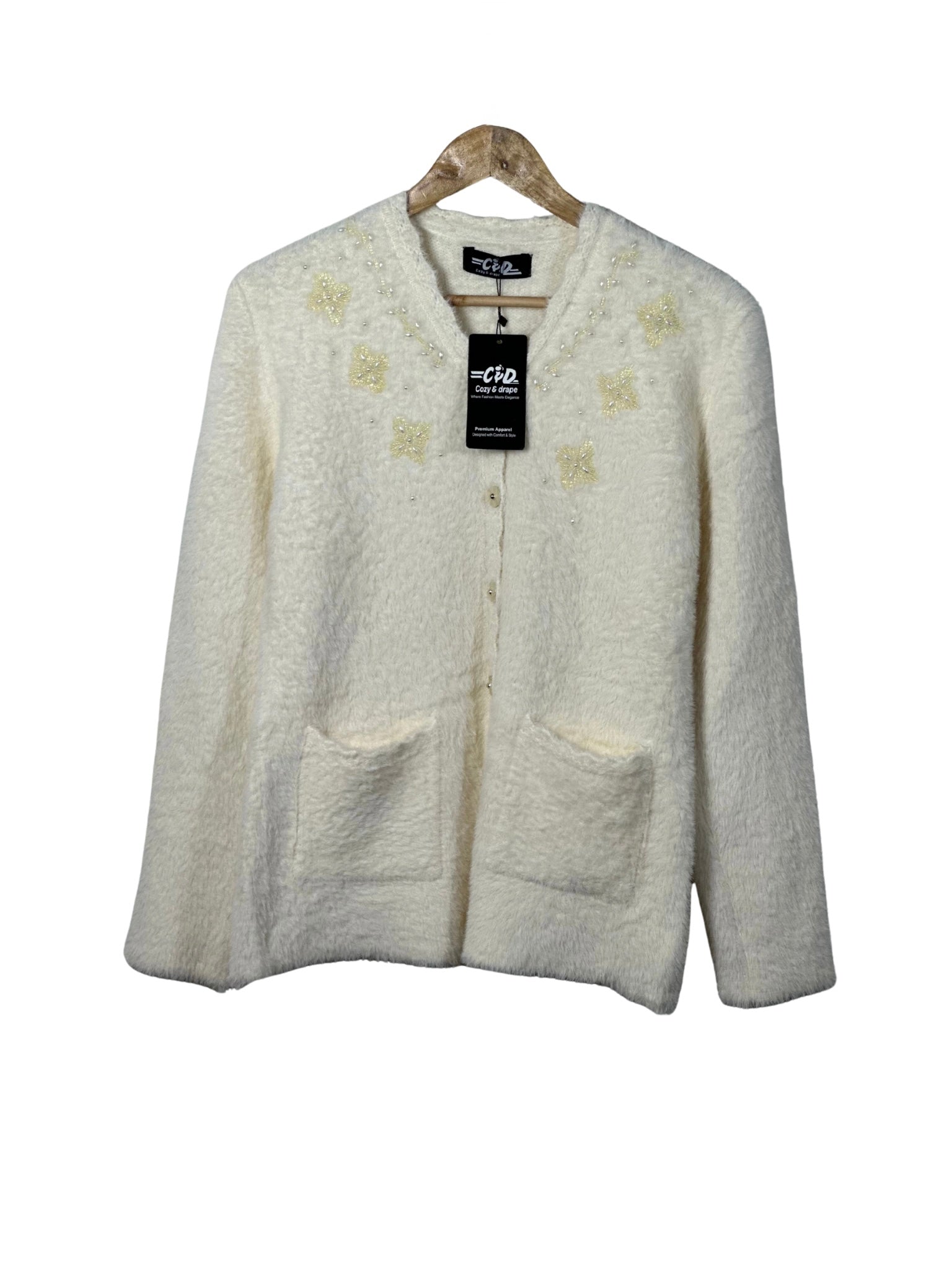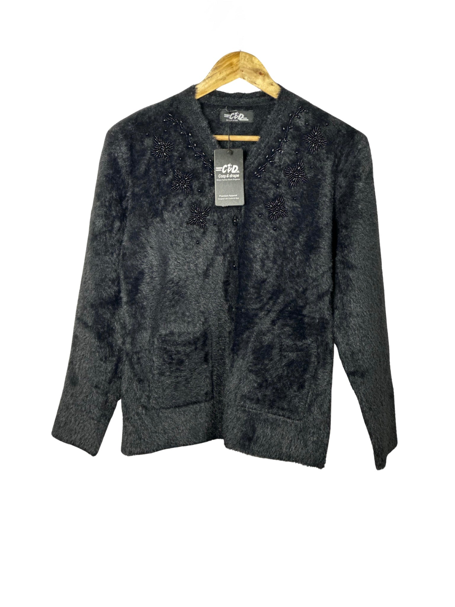 - Open sweater design with convenient front pockets